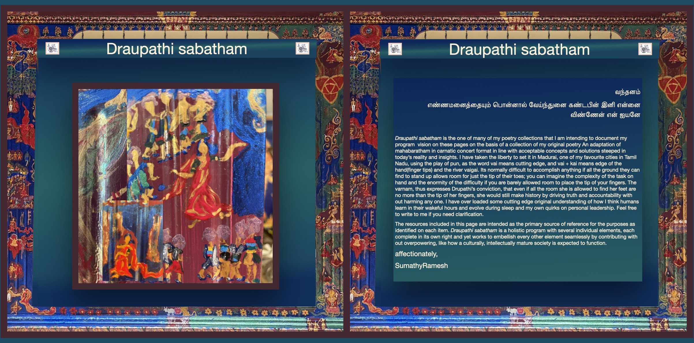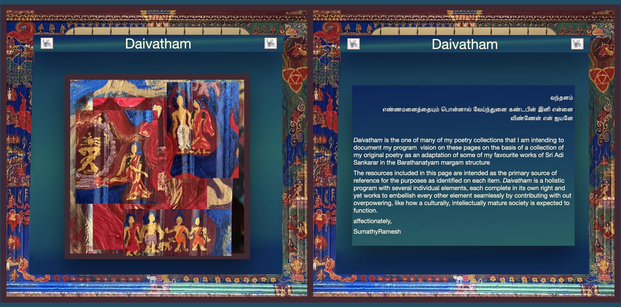 The poetry was written with a basic understanding of Thillana in margam as the piece where the dancer and the audiance indulge in the jubilance of their mutual understanding of the margam through the various pieces. Nuanced explanations of this piece from a choreographer’s perspective will be found in later sections.