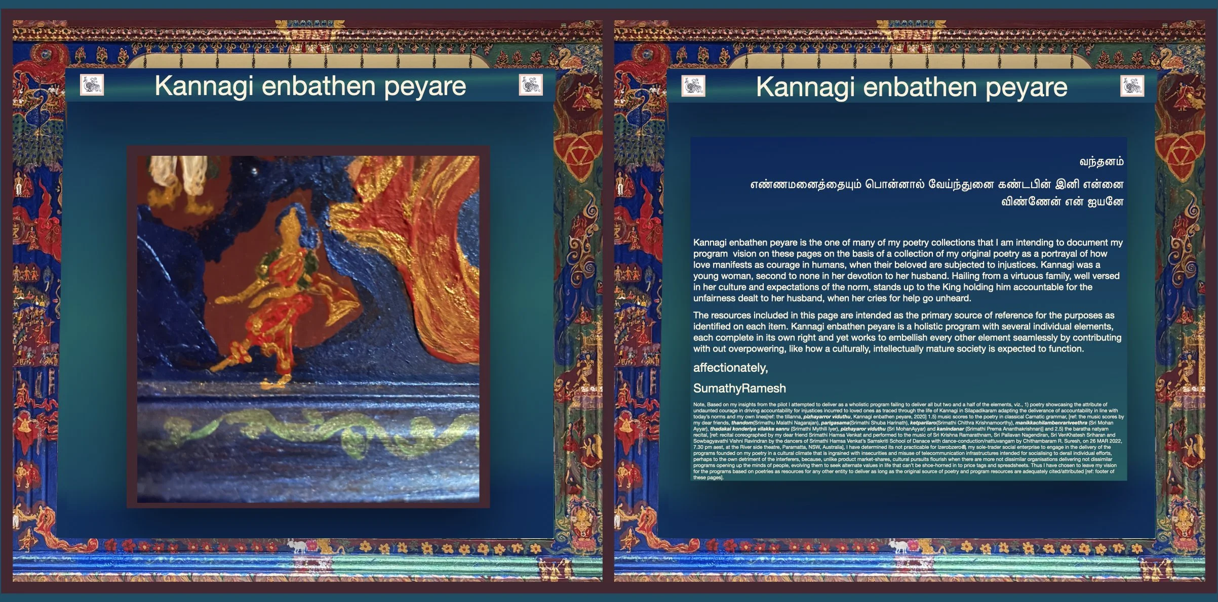An adaptation of புகார்கண்டம் where the poet describes the virtues and accomplishments of the linage of Kannagi and Kovaln, their marriage, their life as they establish themselves as a young couple in Poompuhar, Kovalan’s admiration of Madavi’s artistic excellence, his distraction from Kannagi, his loss in business and their decision to make a new beginning by selling off Kannagi’s ruby studded anklets to raise capital for new venture. The song is set as a narrator’s reflection of what is been. The poetry was written with a basic understanding of Jathiswaram in the margam as a piece to synchronise the dancer as well as the audience through a composition strung on rhythmic syllables. I have taken the liberty to overload a few syllables with meaningful words to engage the audiance into the message of the portrayal of Kannagi in the whole margam. In doing so I employ a spark from the அகண்ட ஜோதி பிழம்பு of their virtuosity: the structure of the rasikapriya jathiswaram by Sri Lalgudi Jayaraman and a unique aspect of concert format KVN used in some of his concerts*, choosing the ragam of the main piece of the concert for the varnam to set the bavam for the whole concert experience. Nuanced explanations of this piece from a choreographer’s perspective will be found in later sections.